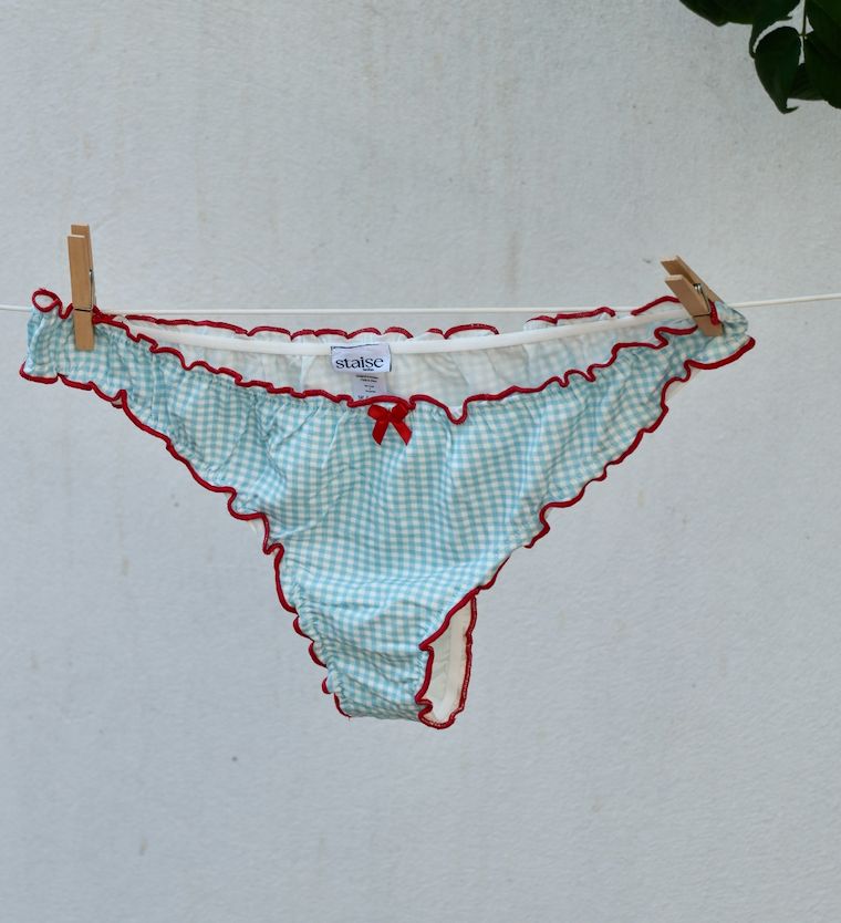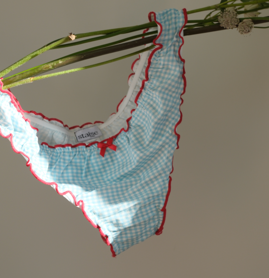 These cheeky gingham knickers are trimmed with soft ruffles and designed to sit perfectly on your hips. Made for prancing, lounging, and flirting with the washing line. Wear them under your jeans or with absolutely nothing at all – we won’t tell.